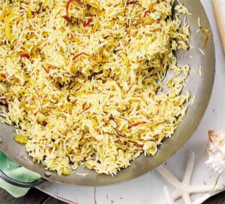 5.Add the parboiled onions to the half cooked rice, cover and cook over a low